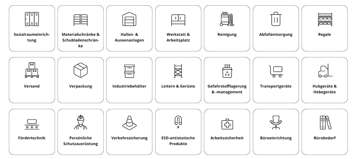 Das Sortiment umfasst Regalsysteme, Transportgeräte, Hub- und Hebetechnik, Gefahrstofflagerung, Betriebssicherheit, Werkzeug- und Arbeitsplatzorganisation, Verpackungslösungen, ergonomische Möbel sowie komplette Einrichtungskonzepte für Lager, Produktionshallen, Werkstätten, Büros und Aufenthaltsbereiche. UDO BÄR unterstützt Betriebe dabei, Materialfluss, Effizienz, Sicherheit und Ergonomie messbar zu verbessern – von kleinen Handwerksbetrieben bis zu internationalen Industrieunternehmen.